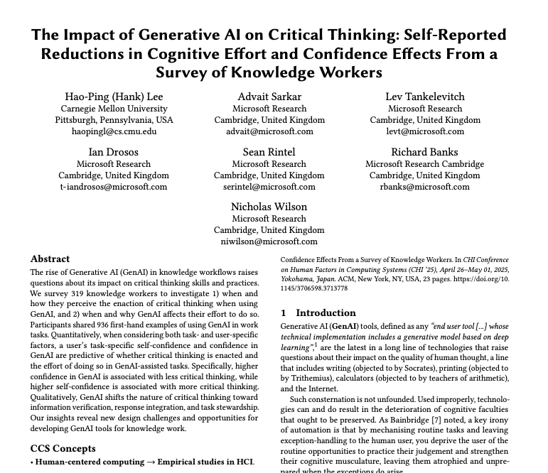 microsoft research found higher confidence in ai correlates with less critical thinking. the more you trust it, the less you think.