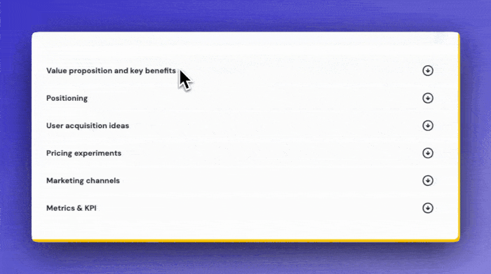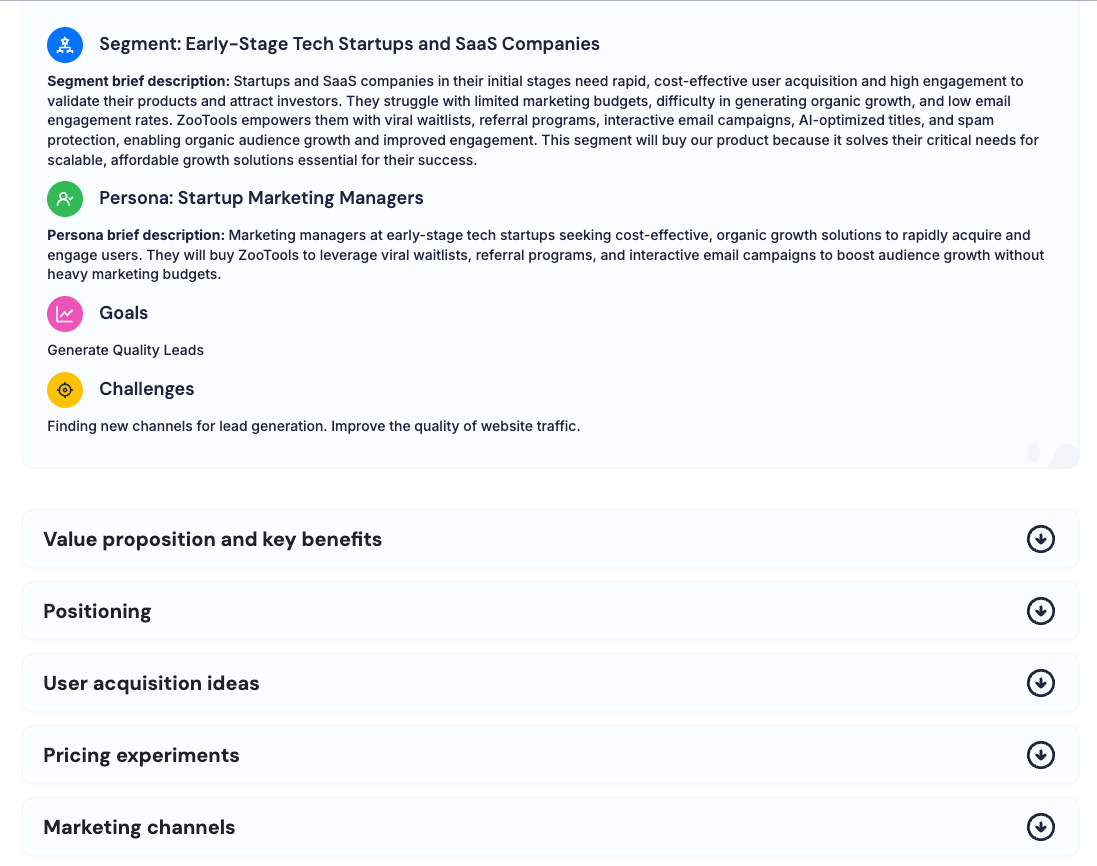 this will generate your business overview, icps, channel ideas, pricing experiments, marketing tactics and more