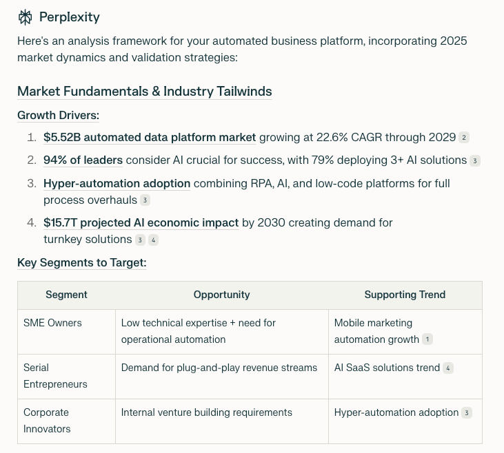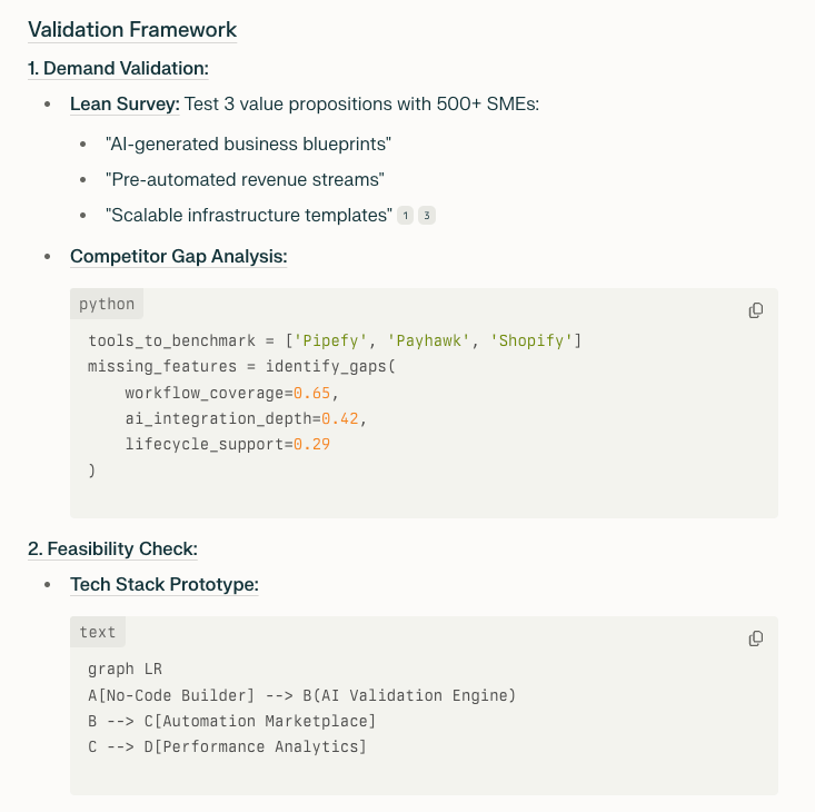 “I'm launching a [insert your business idea in as much detail as possible] please help me analyze market fundamentals, research competition, revenue models and create my validation framework”